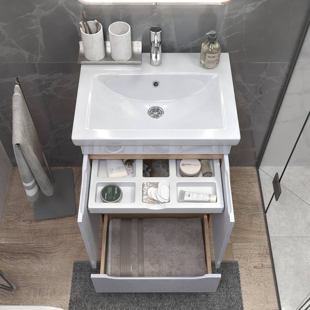 Тумбы Grani оснащены удобным органайзером, который позволяет легко находить и доставать необходимые вещи. Мебель оснащена шариковыми направляющими полного выдвижения, что обеспечивает плавный и бесшумный ход ящика. Еще более комфортное использование мебели делают интегрированные ручки и дверные петли с доводчиком