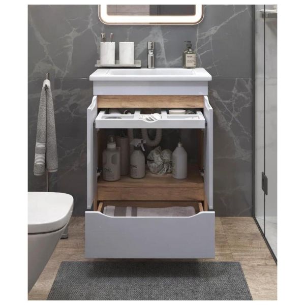 Тумбы Grani оснащены удобным органайзером, который позволяет легко находить и доставать необходимые вещи. Мебель оснащена шариковыми направляющими полного выдвижения, что обеспечивает плавный и бесшумный ход ящика. Еще более комфортное использование мебели делают интегрированные ручки и дверные петли с доводчиком.