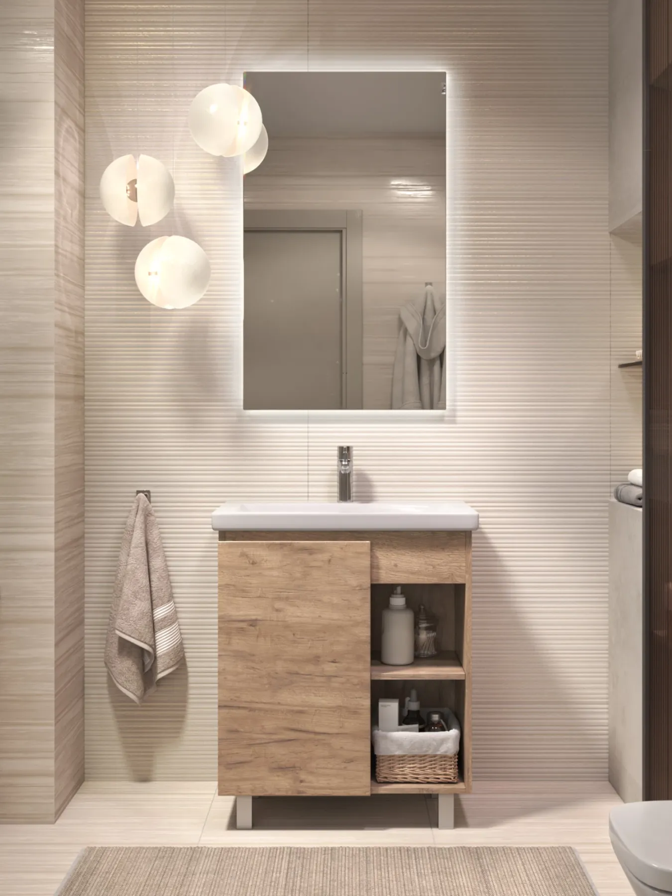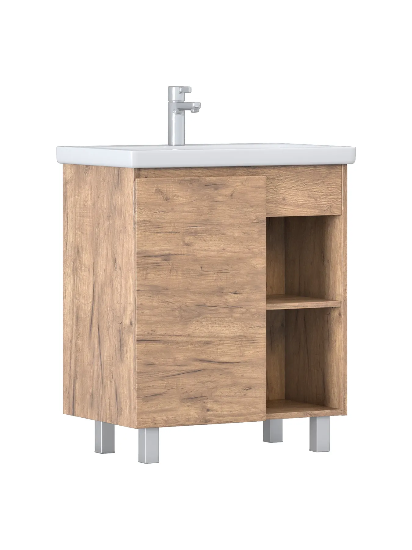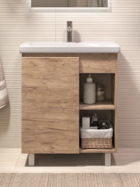 Тумба Milos 70, напольная, 1 дверца, дуб золотой (под ракоовину Como 70). Оснащение: 1 дверца, петли с механизмом доводчика, 2 полки ЛДСП, 4 опоры квадратные регулируемые. Колекция VIGO MILOS: петли с доводчиком, полки из влагостойкой ЛДСП, толщина 16 мм, интегрированные ручки, декор материала с имитацией под дерево.