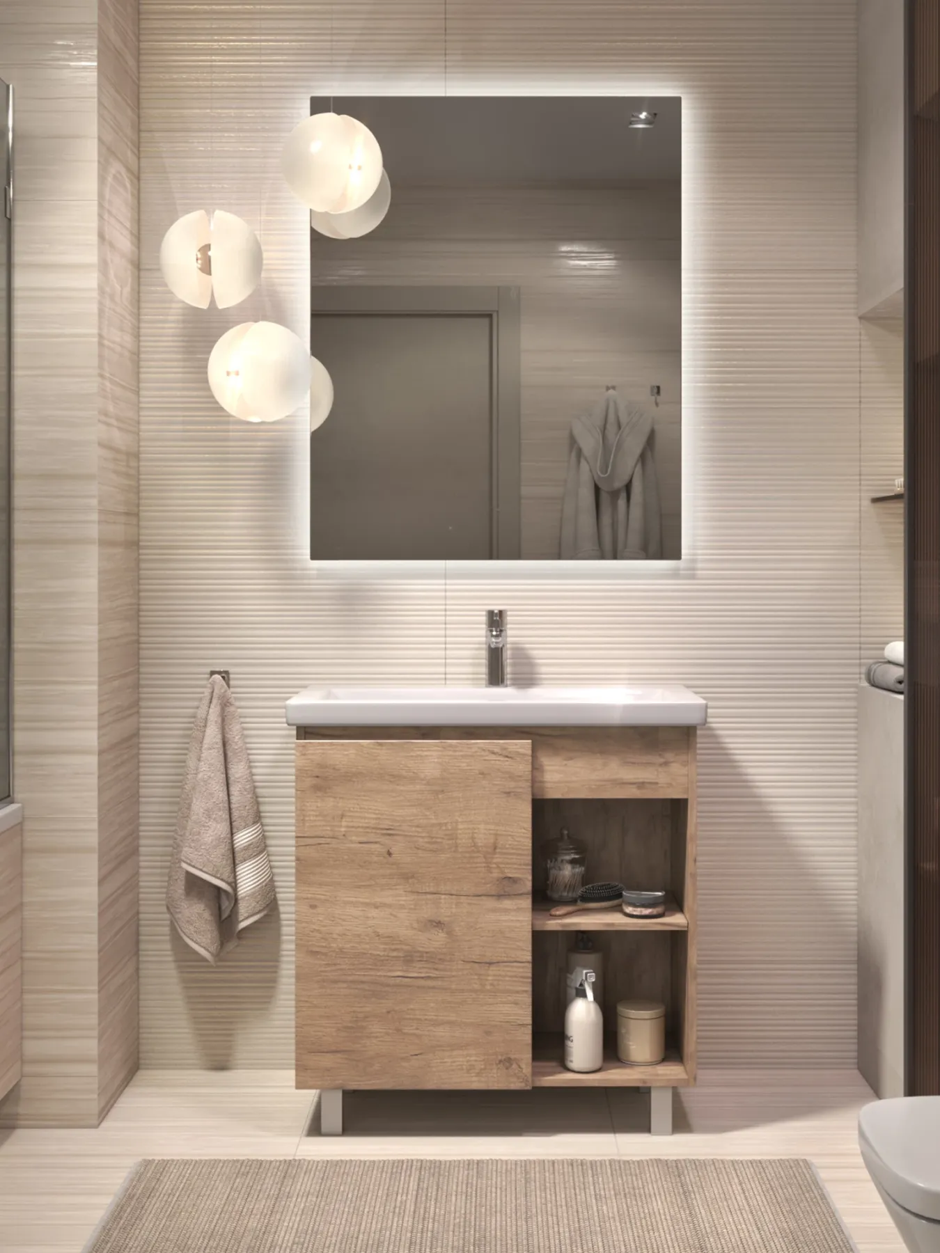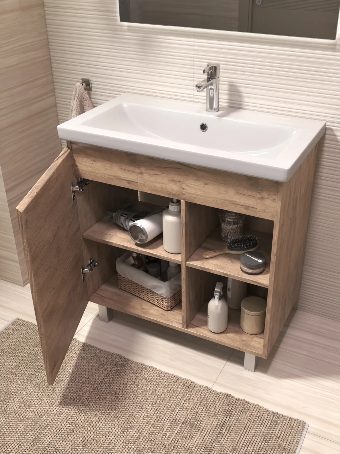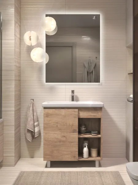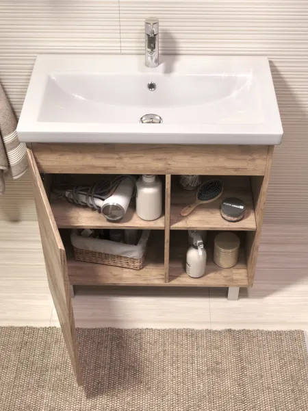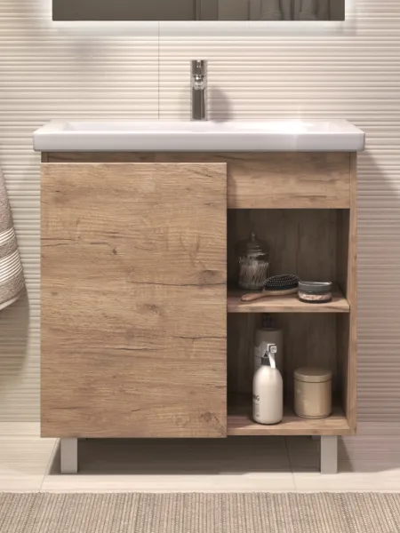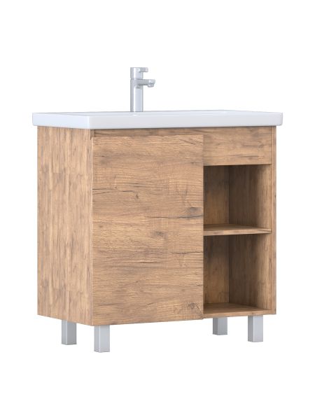 Тумба Milos 80, напольная, 1 дверца, дуб золотой (под ракоовину Como 80). Оснащение: 1 дверца, петли с механизмом доводчика, 2 полки ЛДСП, 4 опоры квадратные регулируемые. Колекция VIGO MILOS: петли с доводчиком, полки из влагостойкой ЛДСП, толщина 16 мм, интегрированные ручки, декор материала с имитацией под дерево.