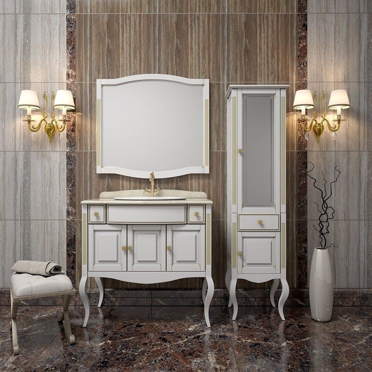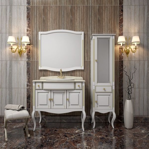 Тумба под раковину Opadiris Лаура 100 Z0000007090 под мраморную столешницу. Цвет: белый матовый с золотой патиной.Выполнена в классическом стиле с плавными изогнутыми формами и изящными гнутыми ножками. Фасадные элементы украшены резными узорами. Особую роскошь добавляют ручки инкрустированные кристаллами Swarovski.Материал фасада/корпуса: массив бука/влагозащищенный МДФ.