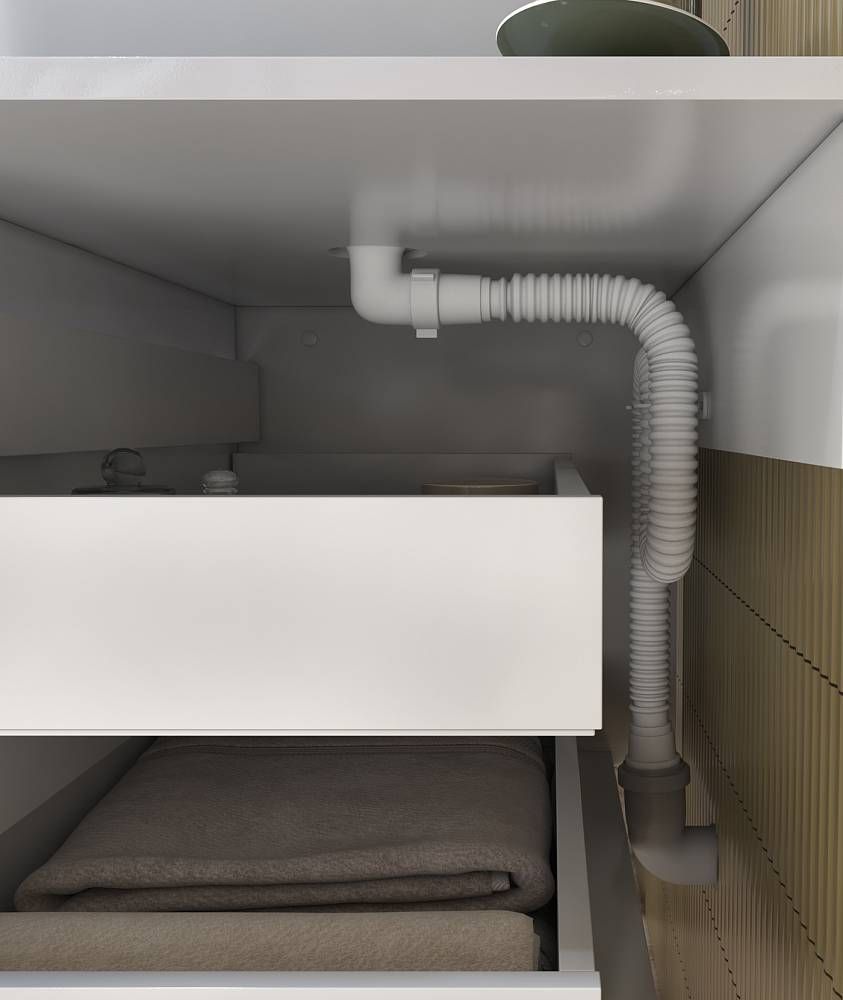 2 ящика. Специальный сифон Vigo в комплекте.Материал корпуса: влагостойкая ЛДСПМатериал фасада: ЛМДФПокрытие фасада: пленка ПВХЯщики: направляющие полного выдвиженияОтсутствие лицевой фурнитуры – интегрированная в фасад ручка