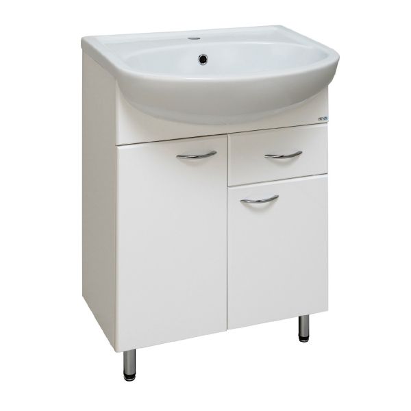 Тумба под умывальник напольная с двумя распашными фасадами и боковым выдвижным ящиком справа. За левым фасадом - одна внутренняя полка. Ящик - на шариковых направляющих, петли со встроенным доводчиком, ручки - 3шт, ножки хром - 2 шт, ножки пластик -2шт.