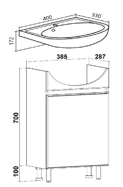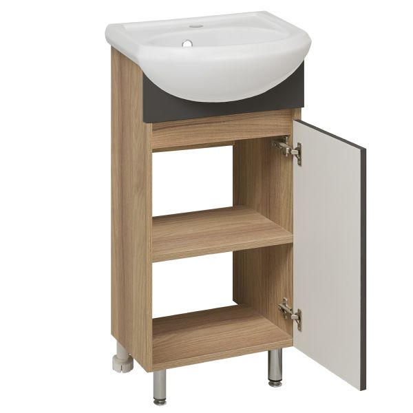 Тумба с раковиной RUNO ЛАДА - модное и оригинальное решение для бюджетного оснащения ванной комнаты. Тумба под раковину ЛАДА (напольная) выполнена в двух цветах - классическом белом и в стильном цвете - графит/серый дуб . Тумба в ванную имеет две распашные дверцы и одну внутреннюю полку. В комплекте идут петли со встроенным доводчиком, 2 хромированные и 2 пластиковые ножки. Тумба для ванной комплектуется раковиной из сантехнического фарфора "Манго" (407х330 мм). Раковина имеет глубину 17 см. Мебель для ванной RUNO - красота и практичность в мелочах!