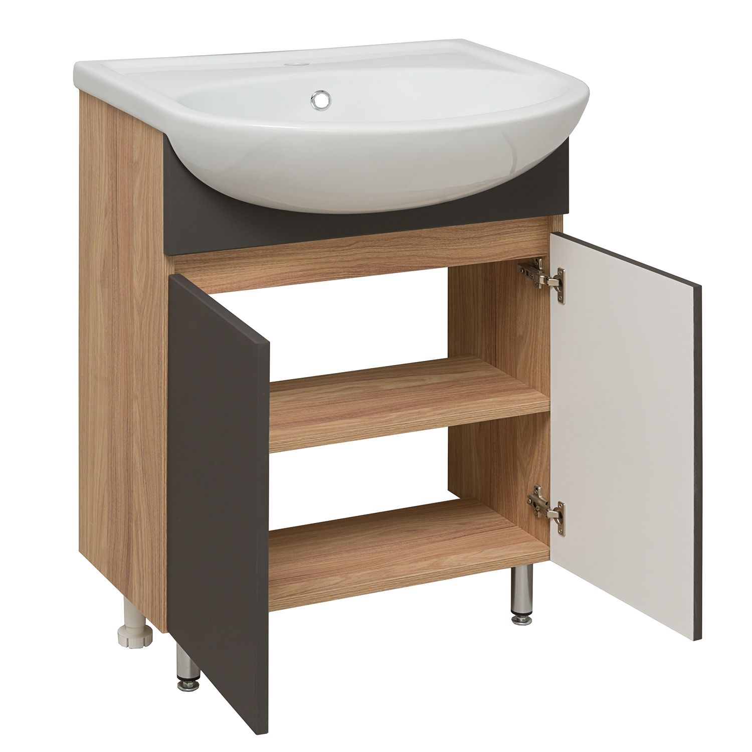 Тумба с раковиной RUNO ЛАДА - модное и оригинальное решение для бюджетного оснащения ванной комнаты. Тумба под раковину ЛАДА (напольная) выполнена в двух цветах - классическом белом и в стильном цвете - графит/серый дуб . Тумба в ванную имеет две распашные дверцы и одну внутреннюю полку. В комплекте идут петли со встроенным доводчиком, 2 хромированные и 2 пластиковые ножки. Тумба для ванной комплектуется керамической раковиной "Уют" (610*470 мм). Раковина имеет глубину 21 см. Раковина имеет глубину 18 см. Мебель для ванной RUNO - красота и практичность в мелочах!