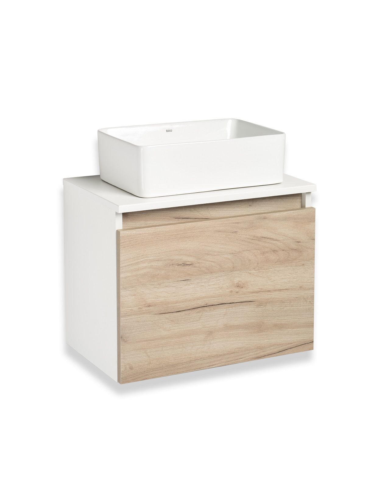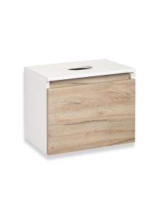 Тумба под раковину в ванную RUNO БАРИ (подвесная) - безупречное сочетание модных тенденций с классическим оформлением ванной комнаты. Тумба под раковину БАРИ оснащена выдвижным ящиком на шариковых направляющих, с системой плавного закрывания. Цвет корпуса классический - белый, при этом цвет фасада в модном цвете – крафтовый дуб, идеально впишутся в любой интерьер ванной комнаты. К тумбе для ванной подойдут умывальники на столешницу: «UNO 24» (24х24см) – очень маленькая модель, идеально подходит для ограниченного пространства в небольших помещениях. Строгая квадратная геометрически правильная форма раковины, усиливает идею лаконичности в дизайне, устанавливается на столешницу, накладным методом. «DUE 38» (38х24см) – маленькая модель, идеально подходит для ограниченного пространства в небольших помещениях. Строгая прямоугольная геометрически правильная форма раковины с округлыми углами, усиливает идею лаконичности в дизайне, устанавливается на столешницу, накладным методом.