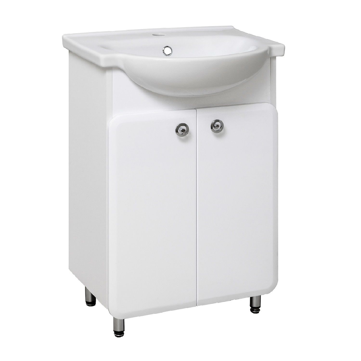 Тумба под умывальник напольная с двумя распашными дверками и одной внутренней полкой. Петли со встроенным доводчиком, ручки - 2шт, ножки хром - 2шт, ножки пластик -2шт.