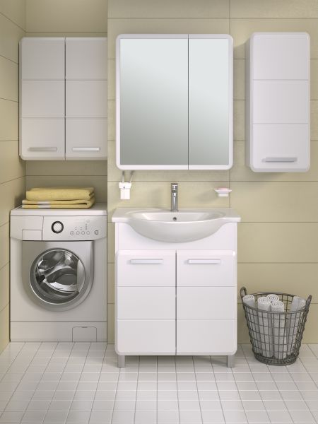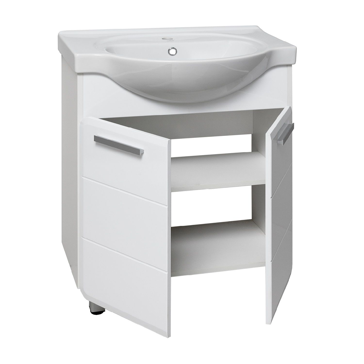 Тумба под умывальник напольная с двумя распашными фасадами и одной внутренней полкой. Петли со встроенным доводчиком, ручки - 2шт, ножки хром - 2шт, ножки пластик -2шт.