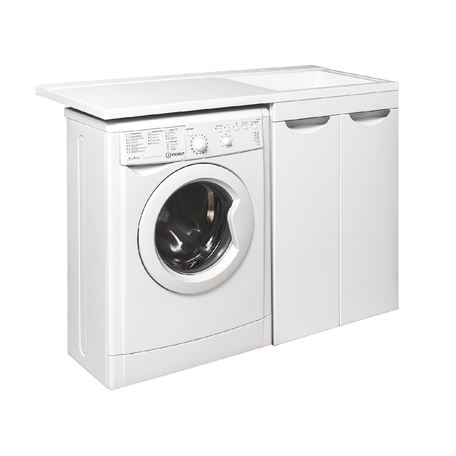 Тумба "Лира" 60 см напольная с двумя распашными дверками и одной встроенной полкой. Устанавливается на 4-е пластиковые опоры, скрытые за нижней съемной фальшь-панелью. Комплект предусматривает установку стиральной машины под крылом умывальника . Умывальник из литьевого мрамора "Gamma 120 лайт" устанавливается на тумбу и кронштейн.