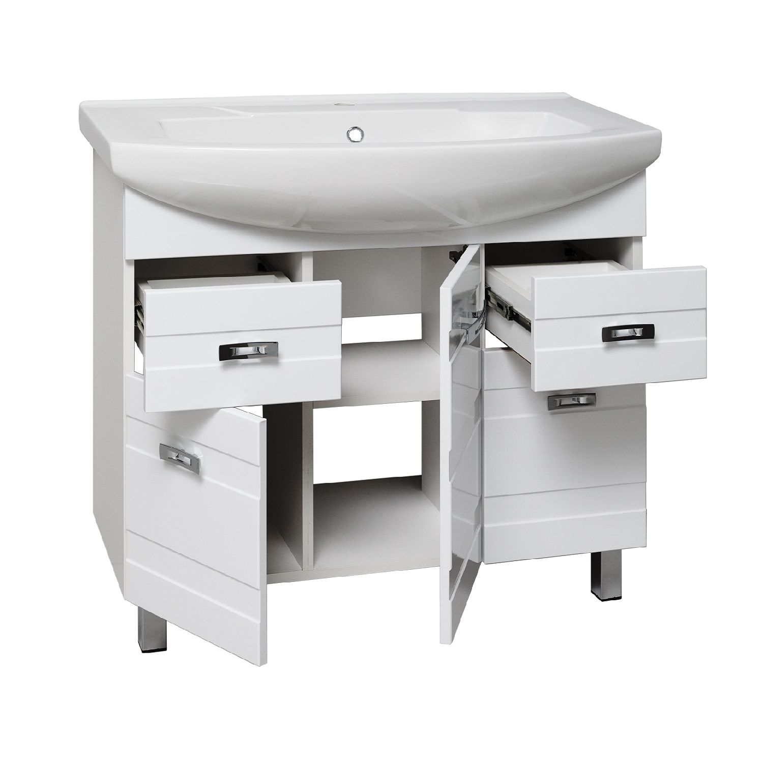Тумба под умывальник на ножках с тремя распашными фасадами и двумя боковыми выдвижными ящиками. За центральным фасадом -одна внутренняя полка. Петли со встроенным доводчиком, ящики на шариковых направляющих полного выдвижения, ручки - 5шт, ножки хром - 2шт, ножки пластик -2шт.