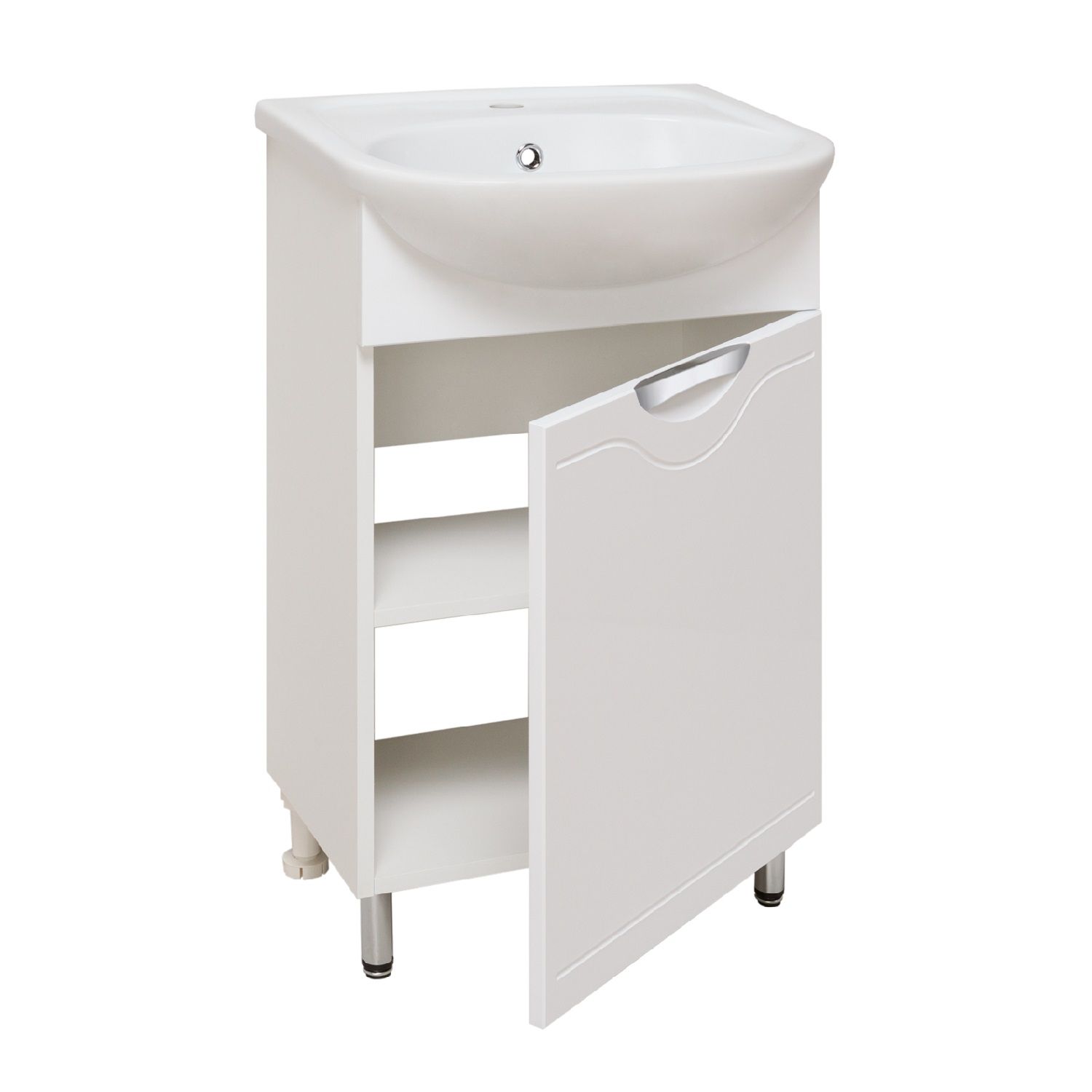 Тумба под умывальник напольная с одним распашным фасадом, открывающимся слева направо (петли справа). Петли со встроенным доводчиком, ручка врезная - 1шт, ножки хром - 2шт, ножки пластик -2шт.