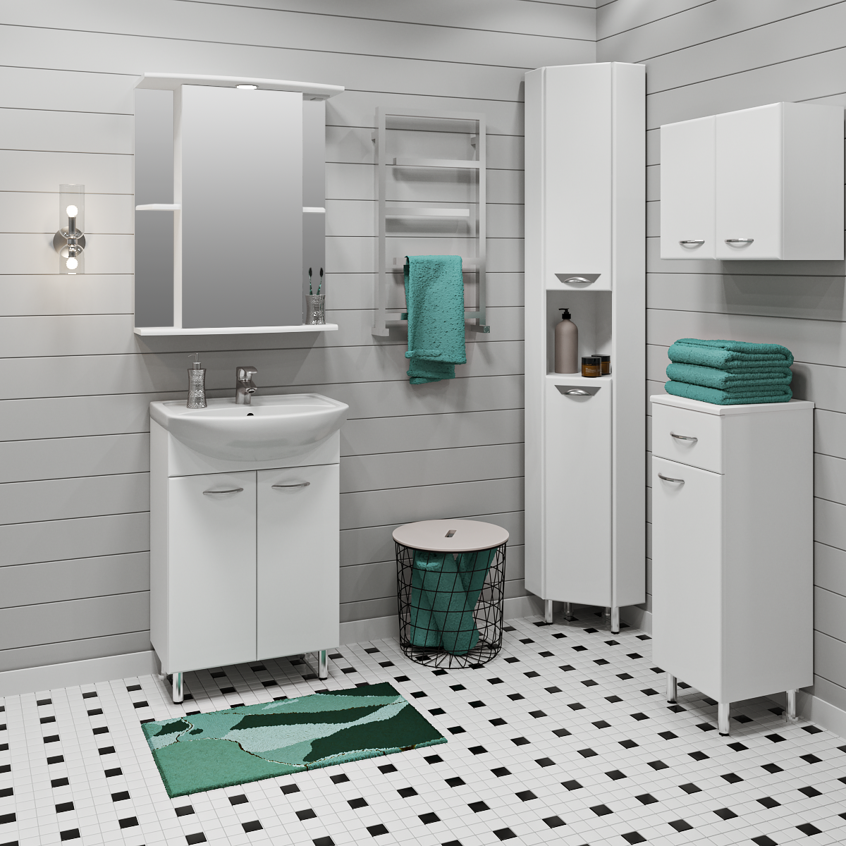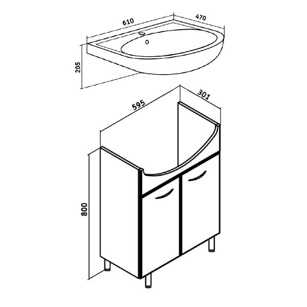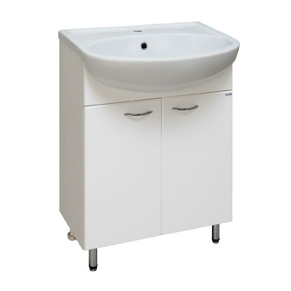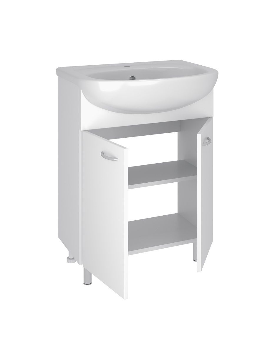 Тумба под умывальник напольная с двумя распашными фасадами и одной внутренней полкой. Петли со встроенным доводчиком, ручки - 2шт, ножки хром - 2шт, ножки пластик -2шт.