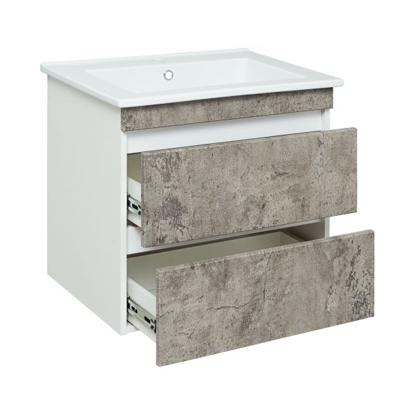 Коллекция мебели "Манхэттен" выполнена в современном стиле. Корпус изделий изготовлен из белого ЛДСП, а фасады облицованы матовой пленкой ПВХ цвета "серый бетон". Тумба под умывальник подвесная с двумя выдвижными ящиками на шариковых направляющих с доводчиком. Навесы - 2шт.