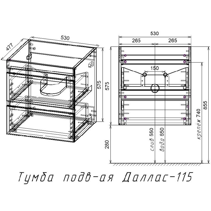 Тумба под раковину Style Line El Fante Даллас 115 Люкс Plus, 115 см, подвесная, 2 ящика, белый, СС-00000651Основные характеристики:Тумба под раковину для установки со стиральной машиной
