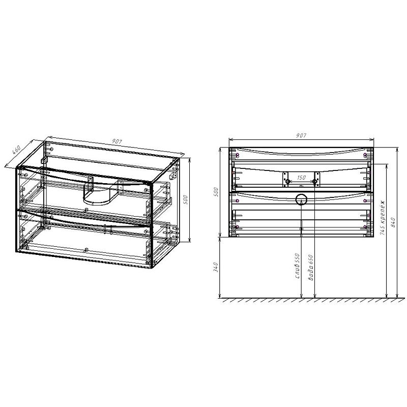 Габариты корпуса тумбы (ШхВхГ): 907х500х460 мм.