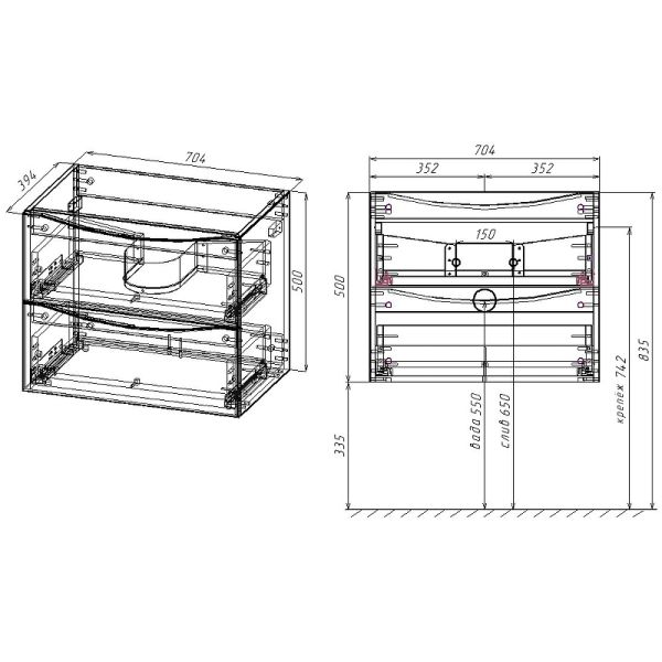 Система хранения: два выдвижных ящика soft close (механизм доводчика).