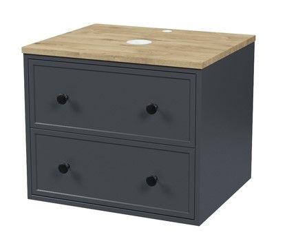 Компактная подвесная тумба Torr трендового темно-серого цвета со столешницей из МДФ в оттенке дуба верона. Сочетает в себе узнаваемый стиль и практичность популярного скандинавского дизайна. Ее четкие формы, теплый цвет дерева, фасады с декоративной филенкой, круглые ручки смотрятся гармонично и впишутся в любой современный интерьер. Подойдет любой накладной умывальник, покупается отдельно.