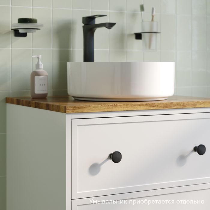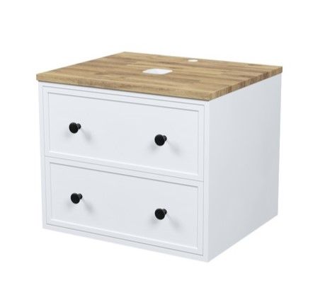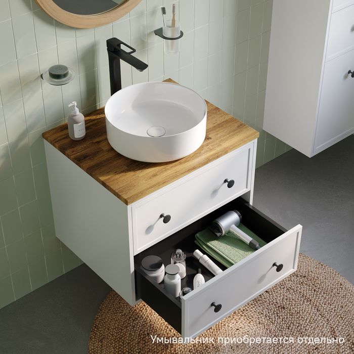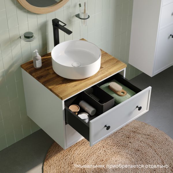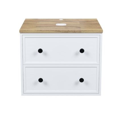 Компактная подвесная тумба Torr классического молочно-белого цвета со столешницей из клееного натурального дуба. Сочетает в себе узнаваемый стиль и практичность популярного скандинавского дизайна. Ее четкие формы, теплый цвет дерева, фасады с декоративной филенкой, круглые ручки смотрятся гармонично и впишутся в любой современный интерьер. Подойдет любой накладной умывальник, покупается отдельно.