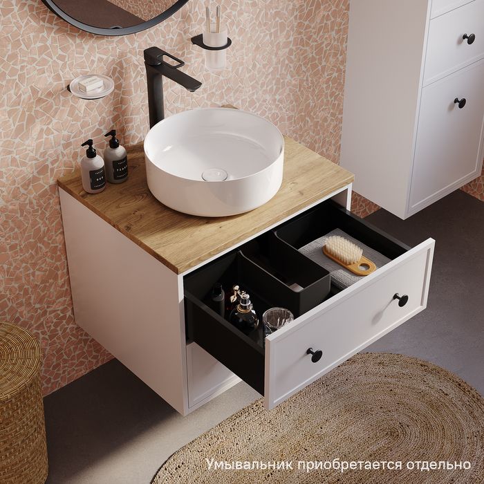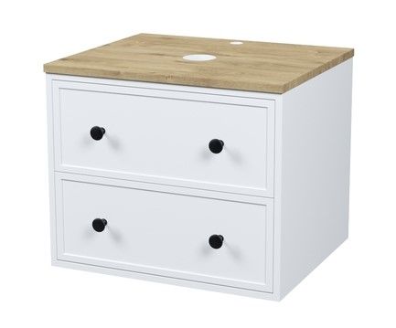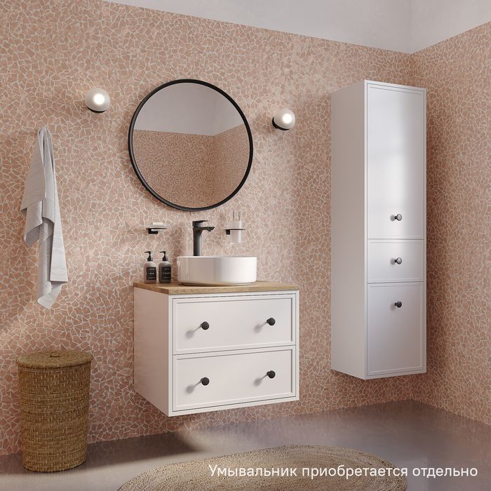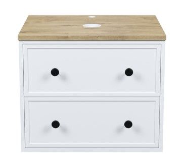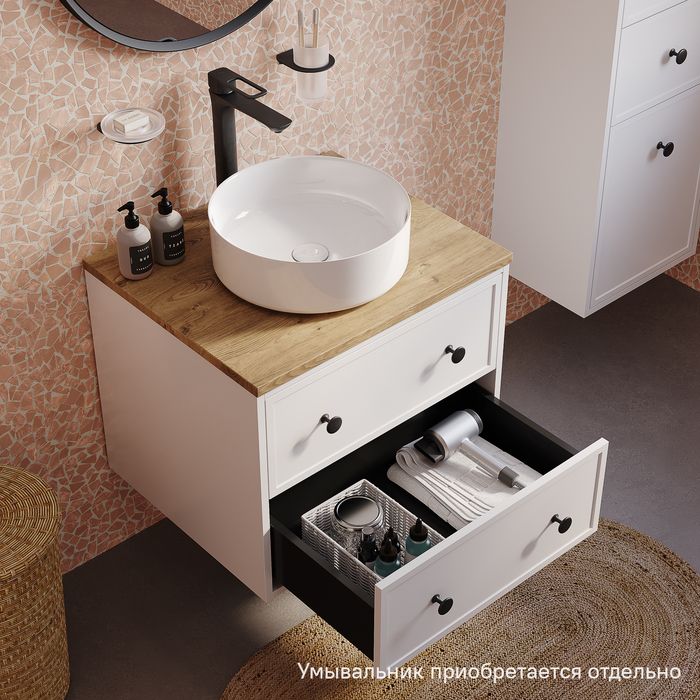 Компактная подвесная тумба Torr классического молочно-белого цвета со столешницей из МДФ в оттенке дуба верона. Сочетает в себе узнаваемый стиль и практичность популярного скандинавского дизайна. Ее четкие формы, теплый цвет дерева, фасады с декоративной филенкой, круглые ручки смотрятся гармонично и впишутся в любой современный интерьер. Подойдет любой накладной умывальник, покупается отдельно.