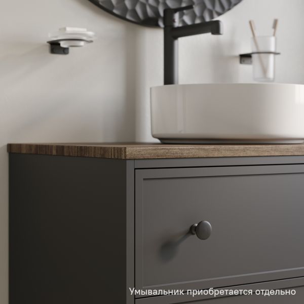 Вместительная подвесная тумба Torr трендового темно-серого цвета со столешницей из МДФ в оттенке ореха макадамия. Сочетает в себе узнаваемый стиль и практичность популярного скандинавского дизайна. Ее четкие формы, теплый цвет дерева, фасады с декоративной филенкой, круглые ручки смотрятся гармонично и впишутся в любой современный интерьер. Подойдет любой накладной умывальник, покупается отдельно.