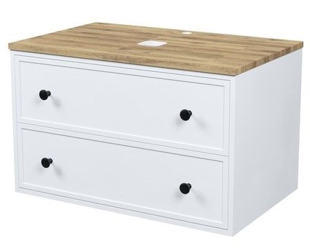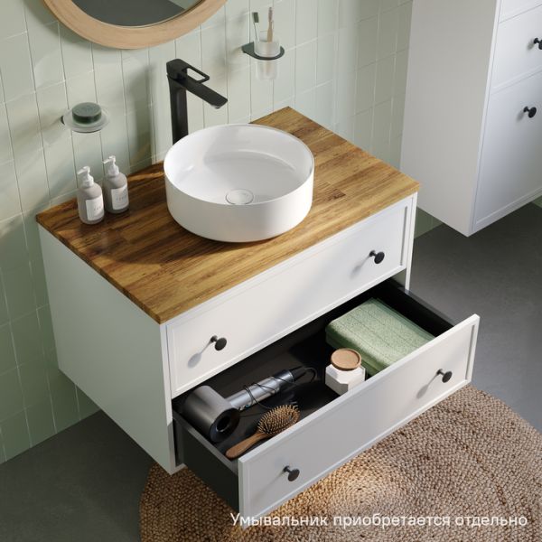 Вместительная подвесная тумба Torr классического молочно-белого цвета со столешницей из клееного натурального дуба. Сочетает в себе узнаваемый стиль и практичность популярного скандинавского дизайна. Ее четкие формы, теплый цвет дерева, фасады с декоративной филенкой, круглые ручки смотрятся гармонично и впишутся в любой современный интерьер. Подойдет любой накладной умывальник, покупается отдельно.