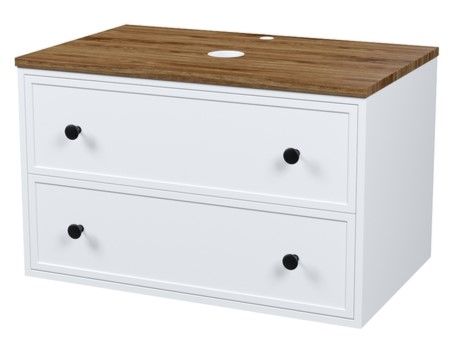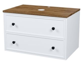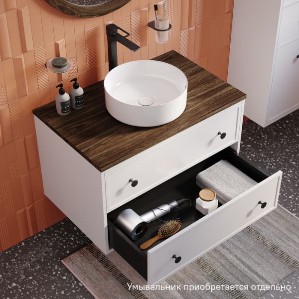 Вместительная подвесная тумба Torr классического молочно-белого цвета со столешницей из МДФ в оттенке ореха макадамия. Сочетает в себе узнаваемый стиль и практичность популярного скандинавского дизайна. Ее четкие формы, теплый цвет столешницы, фасады с декоративной филенкой, круглые ручки смотрятся гармонично и впишутся в любой современный интерьер. Подойдет любой накладной умывальник, покупается отдельно.