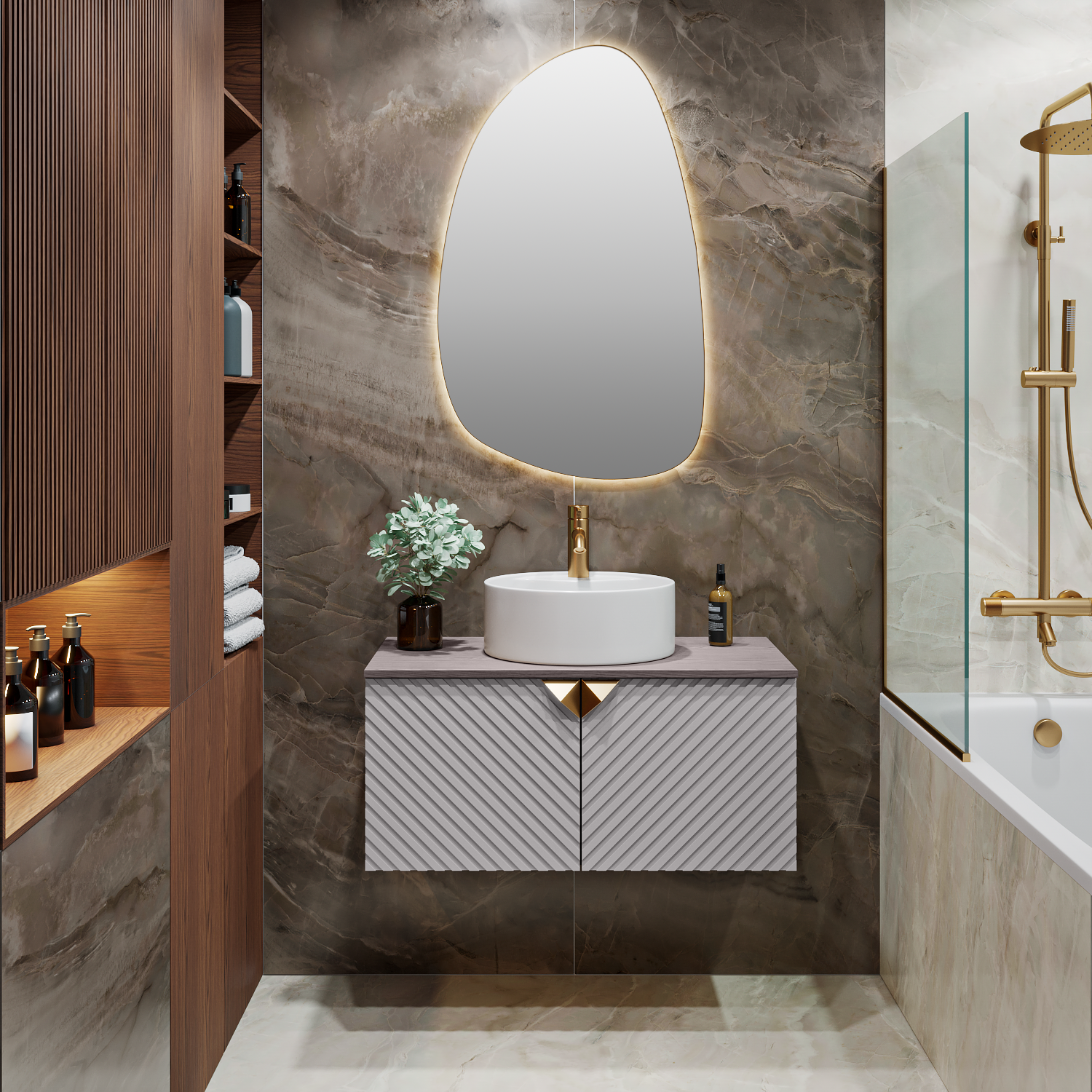 Тумба под раковину в ванную RUNO Андорра (подвесная) – это изысканность и утончённая роскошь в интерьере. Рифленые фасады визуально «оживляют» и «приводят в движение» всю обстановку комнаты, сохраняя при этом умиротворение и покой. Цвета корпуса и фасада имеют идеальное цветовое сочетание серого кашемира и цвета дуба какао, которые идеально впишутся в любой интерьер ванной комнаты. Тумба оснащена двумя распашными дверцами, дверцы укомплектованы петлями верхняя с доводчиком, нижняя без доводчика. К тумбе для ванной подойдут умывальники на столешницу: «OVALE 50» (50х36см) - идеальное решение для стильного интерьера ванной, создан для минималистичных интерьеров и подойдёт для санузлов в стиле лофт, минимализм и хай-тек. Строгая овальная геометрически правильная форма раковины, усиливает идею лаконичности в дизайне, устанавливается на столешницу, накладным методом. «PALLA D41» (диаметр 41см) - идеальное решение для стильного интерьера ванной, создан для минималистичных интерьеров и подойдёт для санузлов в стиле лофт, минимализм и хай-тек. Строгая круглая геометрически правильная форма раковины, усиливает идею лаконичности в дизайне, устанавливается на столешницу, накладным методом. «TRE 48» (48х37см) - идеальное решение для стильного интерьера ванной, создан для минималистичных интерьеров и подойдёт для санузлов в стиле лофт, минимализм и Хай-Тек. Строгая прямоугольная форма с округлыми углами усиливает идею лаконичности в дизайне, устанавливается на столешницу, накладным методом. «TERZO 60» (59х39см) - идеальное решение для стильного интерьера ванной, создан для минималистичных интерьеров и подойдёт для санузлов в стиле лофт, минимализм и хай-тек. Асимметричная раковина, которую можно установить любой стороной, дизайнерское решение для нестандартных интерьеров, усиливает идею лаконичности в дизайне, устанавливается на столешницу, накладным методом. И другие накладные раковины бренда RUNO.