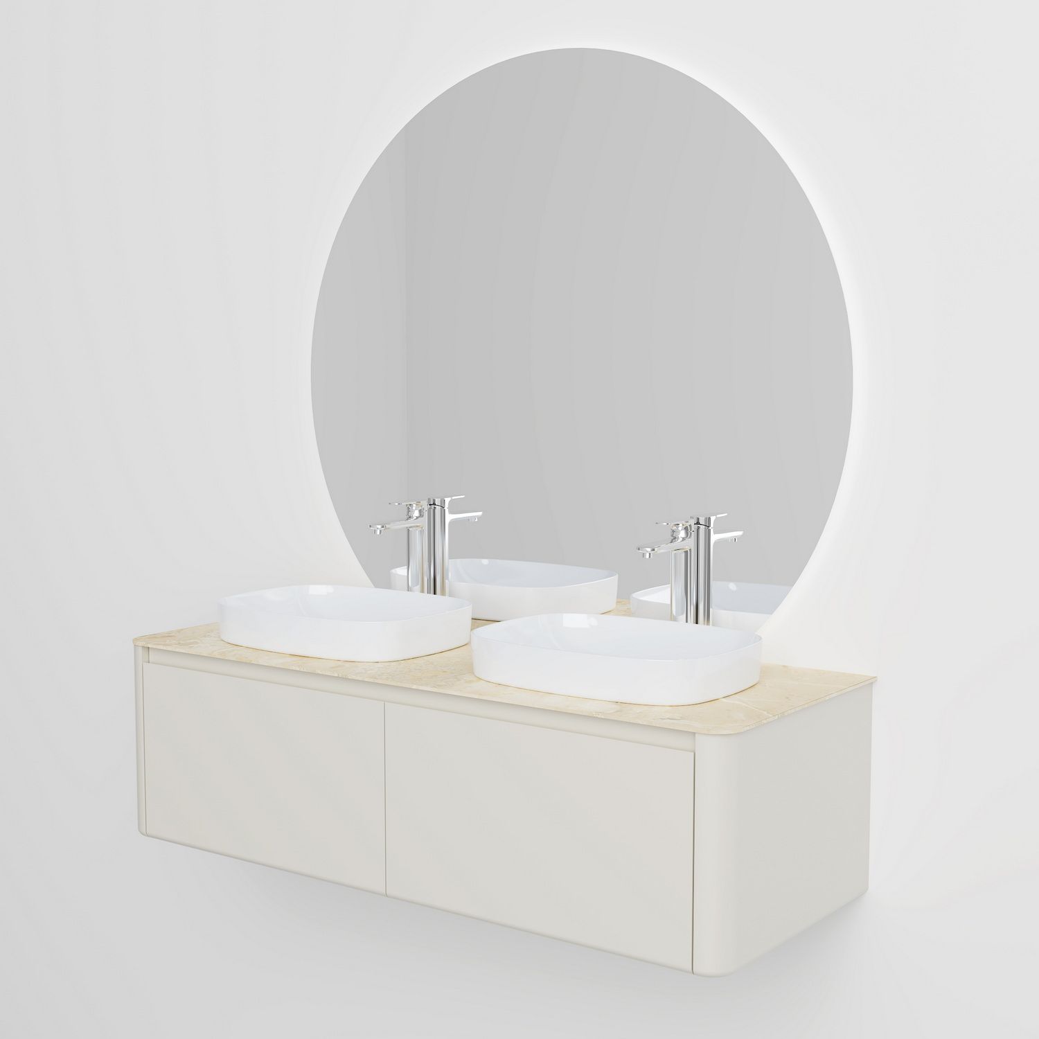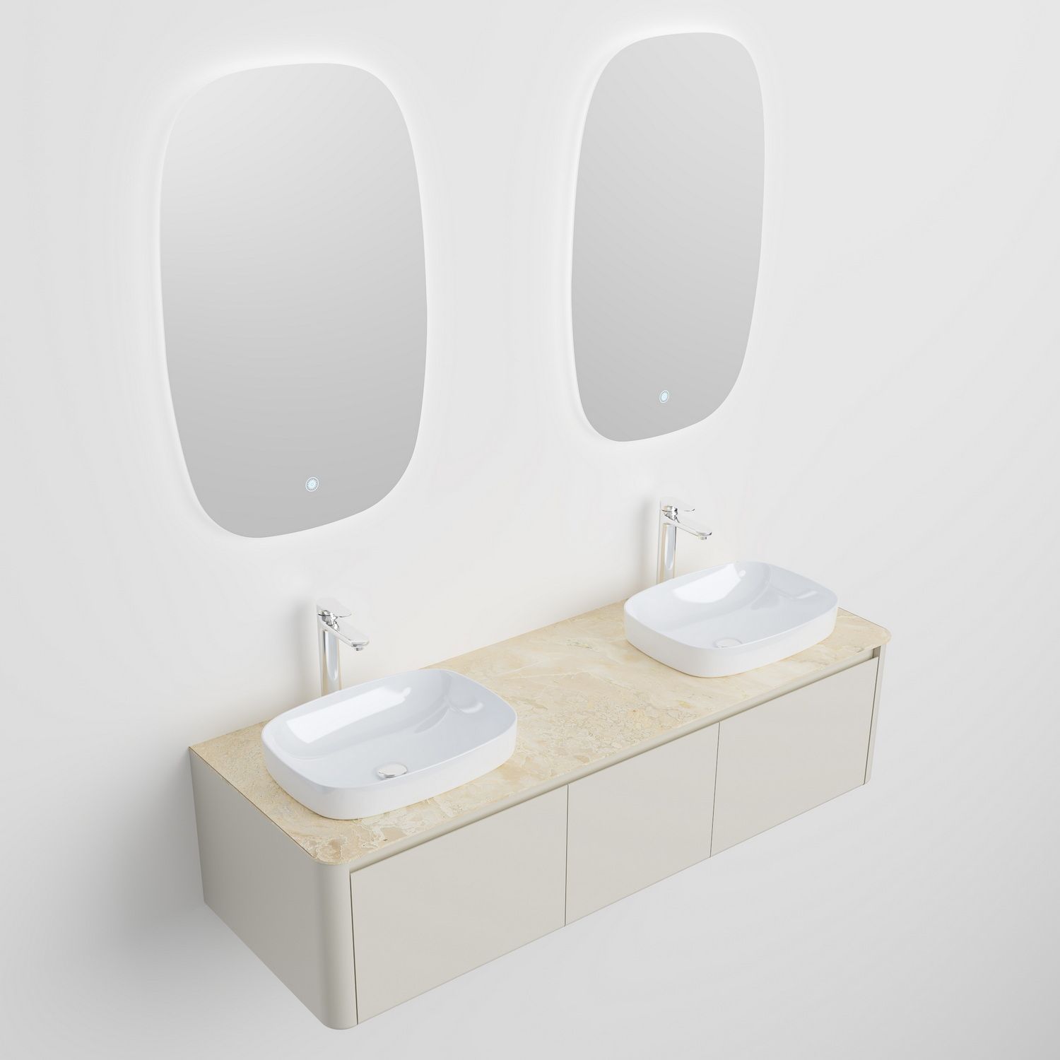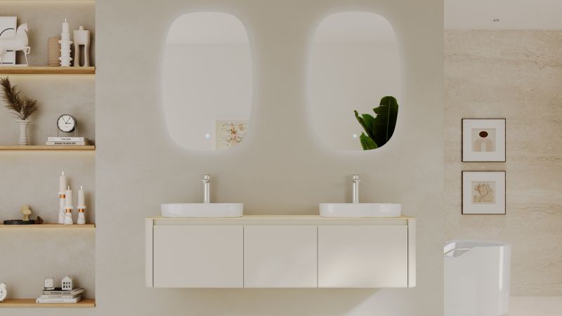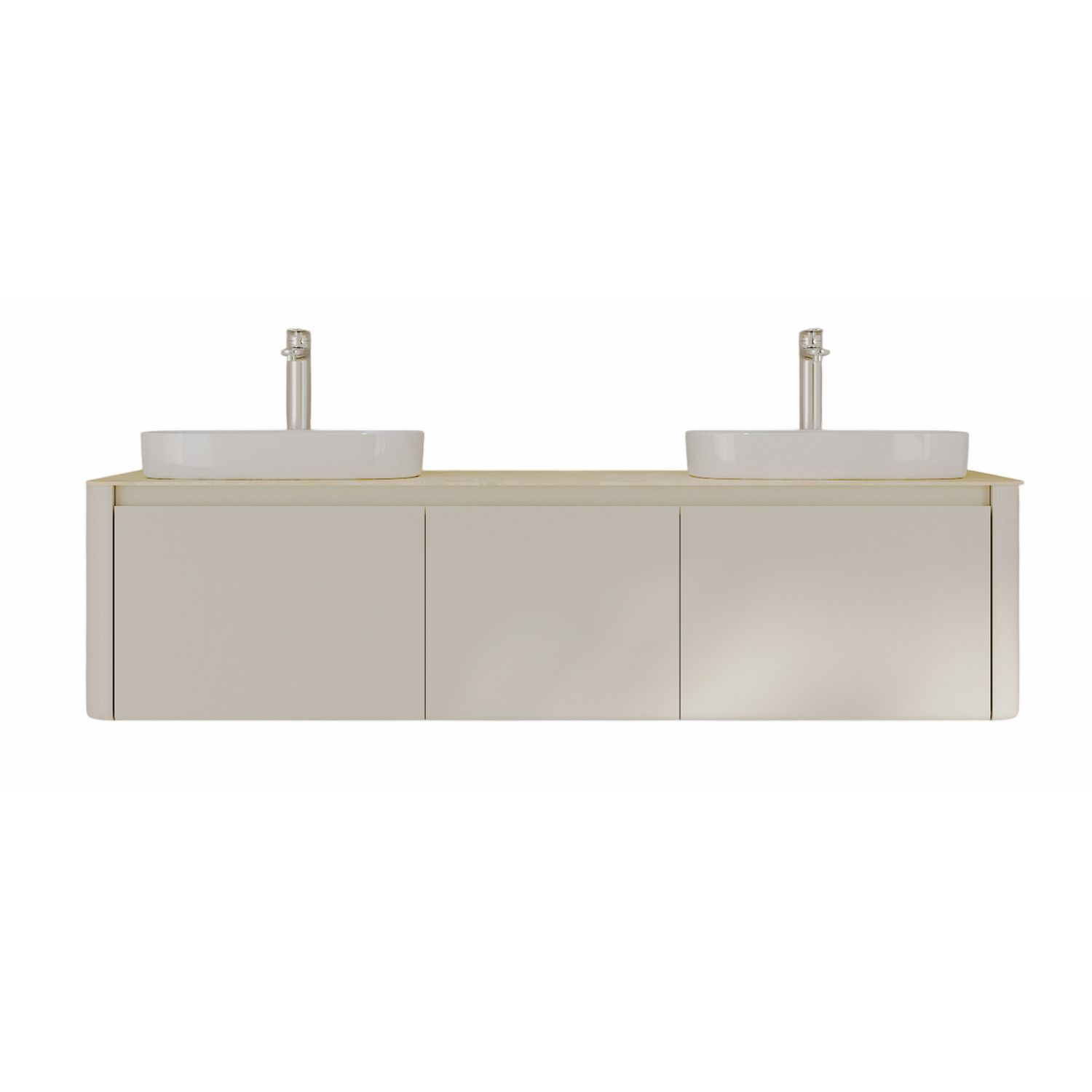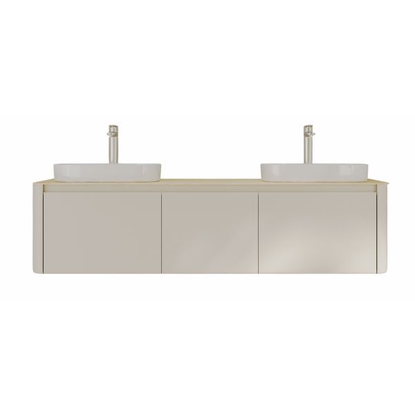 Минималистичная мебель датского производителя Black&White в габаритных размерах 160×55 см. Столешница выполнена из утонченного керамогранита стилизованного под натуральный мрамор кремового цвета в сочетании с белой основой . Полувстраиваемые раковины поставляются вместе с донным клапаном и изготавливаются из сантехнического фарфора, а невысокие борта позволяют устанавливать смеситель любой высоты. База изготовлена из влагостойкого MDF и покрыта эмалью в цвете слоновая кость, а для открывания выдвижных ящиков установлены направляющие австрийской компании Blum. Комплект крепежа с крепежной планкой идет в комплекте.