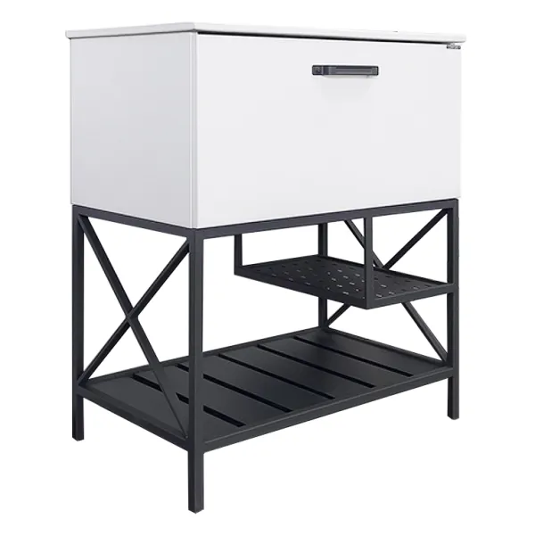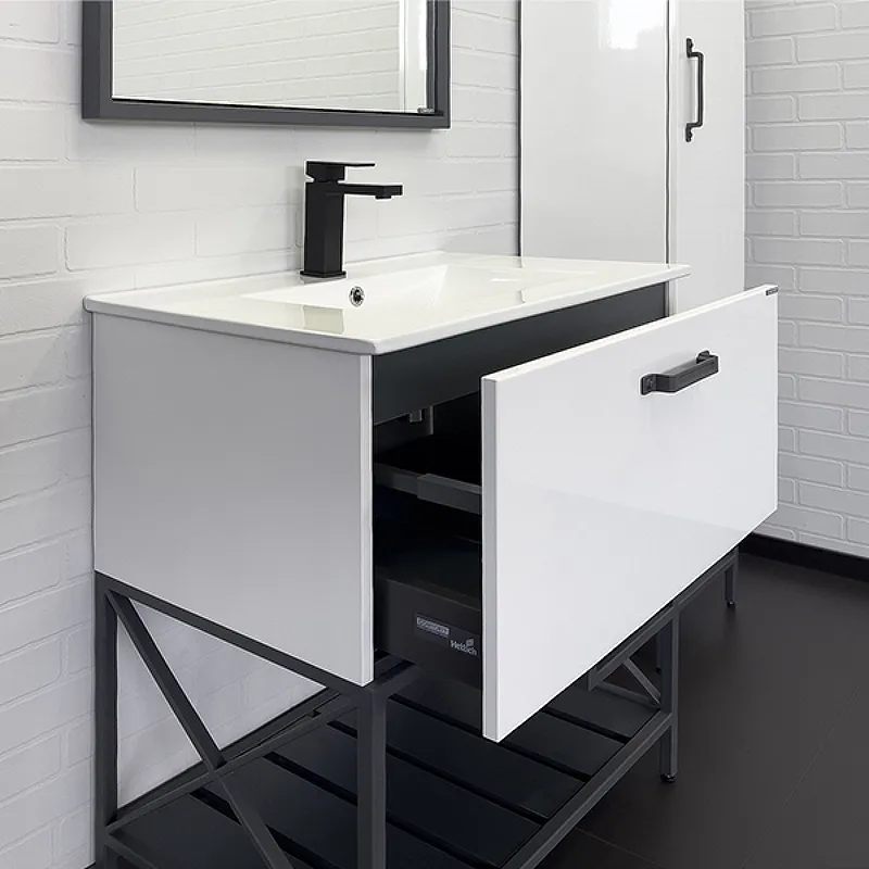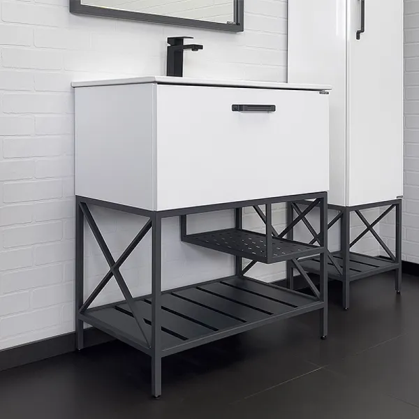 Тумба с раковиной Comforty Бредфорд 00-00013442 75.5 см белый графитНапольная тумба с одним большим выкатным ящиком оборудованным системой плавного закрывания. Корпус тумбы изготовлены из влагостойкого ДСП, фасад из МДФ. Корпус и фасад окрашены белой глянцевой эмалью. В комплекте белая раковина с прямоугольной чашей. В основе тумбы - каркас из стального профиля окрашенный эмалью цвет серый графит с нижней широкой полкой и средней полкой для полотенец. Стильная ручка ящика в том же цвете что и каркас. Тумба подготовлена для подключения водоснабжения снизу. Комплектация: белая керамическая раковина Comforty 75E