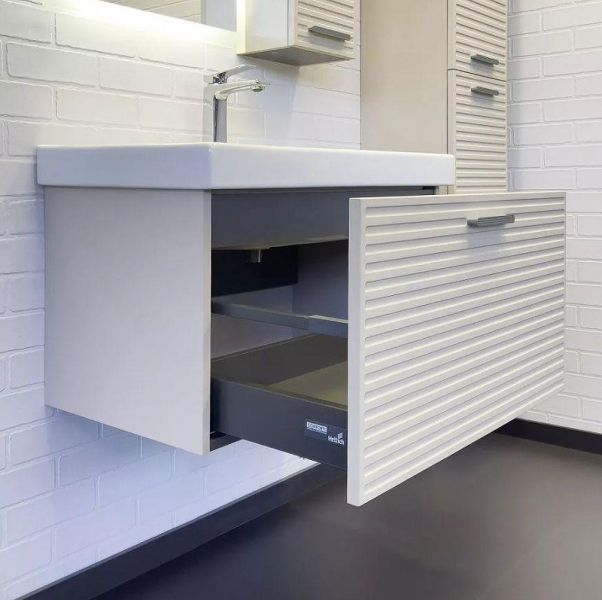 Тумба с раковиной Comforty Касабланка 00-00019529 80 см Серый шелкПодвесная тумба с одним выкатным ящиком c направляющими оборудованными системой плавного закрывания. Корпус тумбы изготовлены из влагостойкого ЛДСП. Фасад тумбы из МДФ фрезерован горизонтальным узором и обтянут в пленку цвета серый шёлк. Тумба подготовлена для подключения водоснабжения снизу и сзади.Характеристики:Тумба:Цвет: серый шелк.