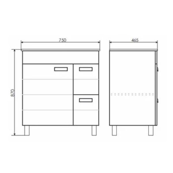 Габариты тумбы с раковиной (ШхВхД): 750х870х465 мм.