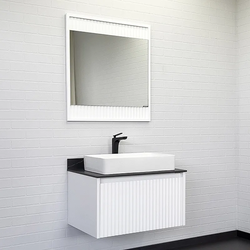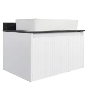 Тумба с раковиной Comforty Марсель 00-00013396 75 см Белая матоваяХарактеристики: Тумба: Цвет: белый матовый. Цвет столешницы: под мрамор Калакатта Блэк. Материал тумбы: влагостойкий ЛДСП, МДФ. Фасад тумбы фрезерован геометрическим узором с имитацией волны. Материал столешницы: керамогранит. Организация хранения: ящик с системой плавного закрывания. Тумба подготовлена для подключения водоснабжения снизу. Монтаж: подвесной. Раковина-чаша: Цвет: белый. Материал: санфарфор. Форма: прямоугольная. В комплекте поставки: тумба, столешница, раковина-чаша Comforty 78189, крепежный комплект
