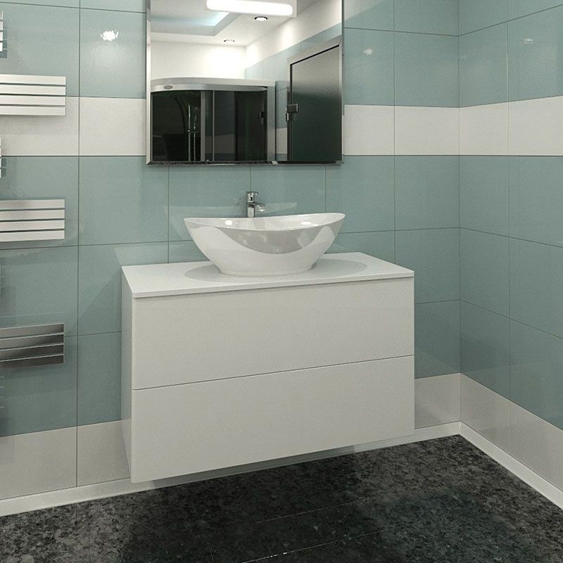 Подвесная тумба с раковиной-чашей и столешницей МДФ, с двумя выдвижными ящиками. Предназначена для использования в ванных комнатах с повышенной влажностью. Система Push to Open: ящики открываются нажатием на них. Высокое качество сборки, материалов и фурнитуры. Столешница, корпус и фасад: МДФ, плёнка ПВХ белая глянцевая. Раковина накладная (глубина 10 см) - фаянс.