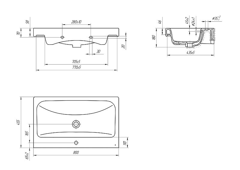 Стильная раковина лаконичной прямоугольной формы шириной 80 см подходит для установки на столешницу. Гармонично сочетается с тумбами для санузлов.