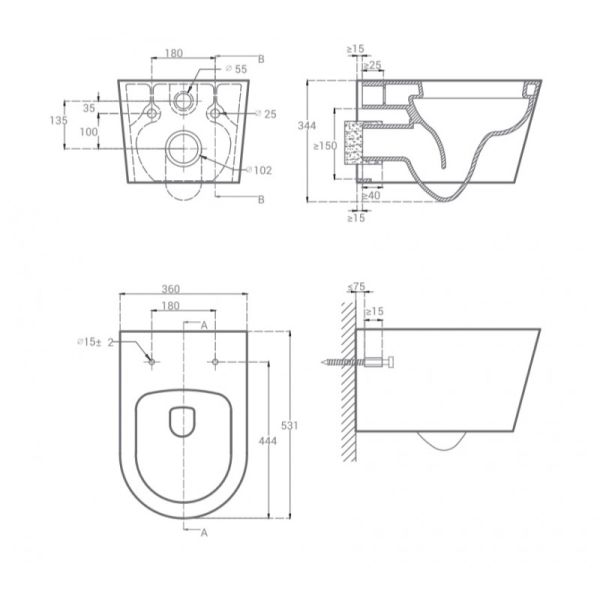 • Прилегание унитаза к стене: