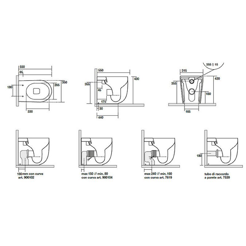 • Прилегание унитаза к стене: