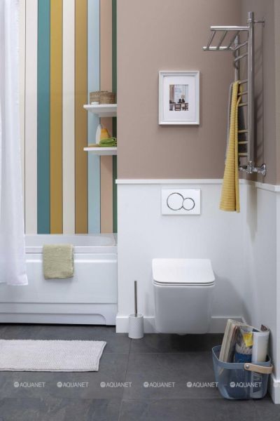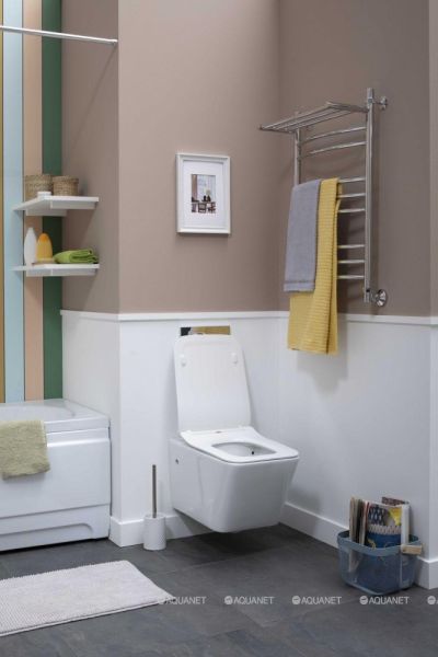 Унитаз подвесной Aquanet Rimless Tavr дополнит санузел в стиле модерн или неоклассики, благодаря своей прямоугольной стильной форме и компактным размерам. Чаша выполнена из керамики, а идущая в комплекте крышка-сиденье — из дюропласта. Покрытие модели антигрязевое, что обеспечивает дополнительную защиту от образования сложновыводимых загрязнений. Унитаз крепится на стену, а все коммуникации с помощью инсталляции убираются в стену. Кнопка смыва и инсталляция приобретаются отдельно. Преимущество подвесных моделей заключается в том, что с ними легче убираться в санузле, они не занимают много пространства и способны поместиться даже в ванных и туалетных комнатах малых размеров.
