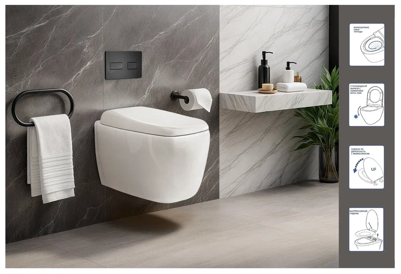 В комплекте присутствует легкосъемное сидение с крышкой, оснащенное системой микролифт (для плавного и бесшумного опускания). Крепления к чаше выполнены из стали, а само сидение - из долговечного полимерного материала – дюропласта с антибактериальным покрытием. Снятие осуществляется одним нажатием кнопки.Смыв в унитазе происходит по принципу TORNADO – поступающая из отверстия в чаше вода мощным потоком закручивается (эффект водоворота) и полностью очищает всю внутреннюю поверхность чаши. При этом воды требуется на качественный смыв в небольшом количестве.Внимание! Производитель оставляет за собой право вносить изменения в конструкцию и комплектацию моделей без предварительного уведомления!