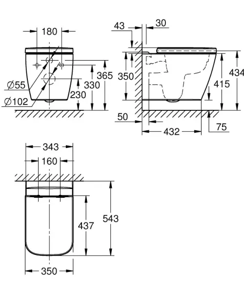 • Прилегание унитаза к стене: