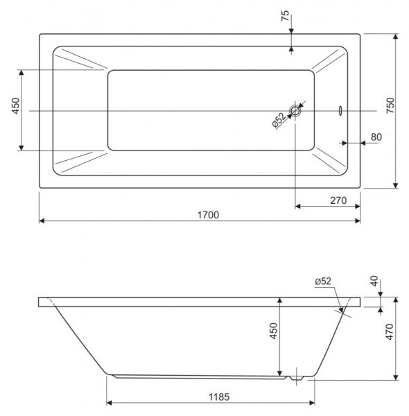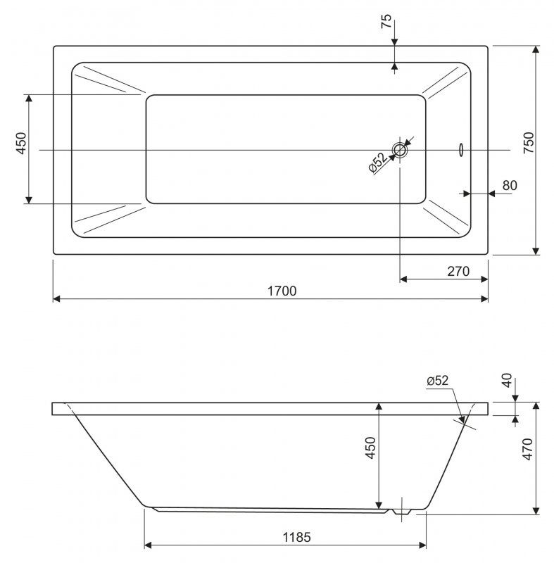 Ванна акриловая Cezares PLANE SOLO-170-75-45-W37