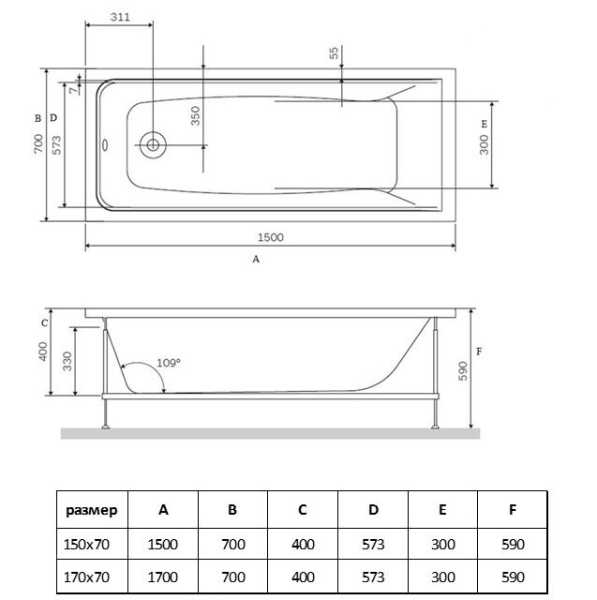 Ванна акриловая Vincea VBT-2G170-LG с ножками 1700*700*470, пристенная, цвет белый купить
