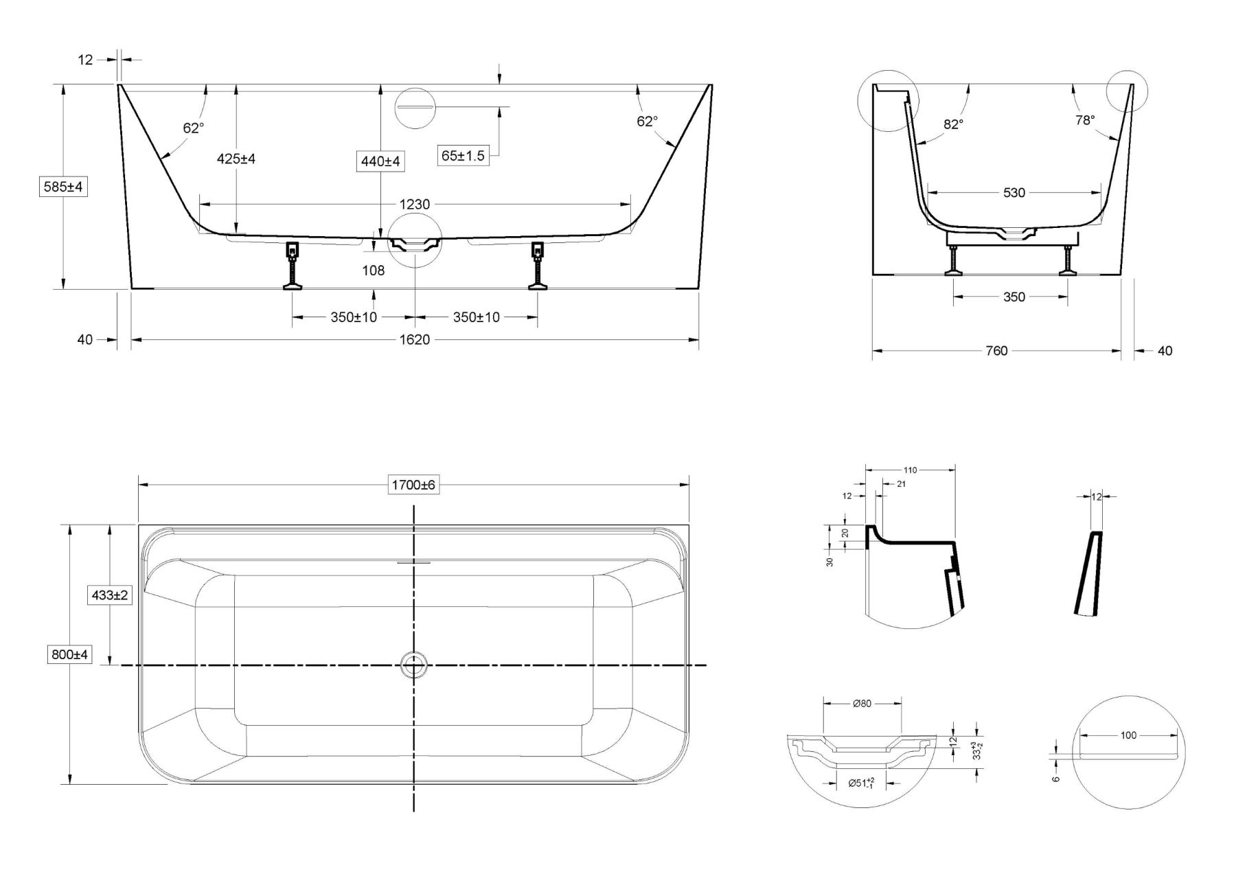 Ванна акриловая Vincea VBT-702-1700, цвет белый, щелевой перелив