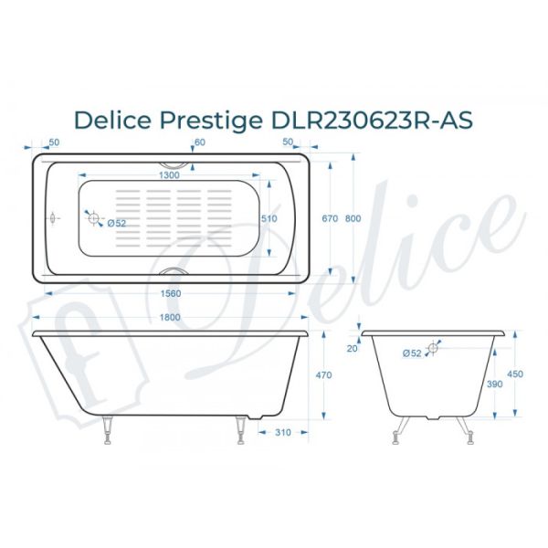 Ванна чугунная Delice Prestige DLR230623R-AS 180х80 с отверстиями под ручки и антискользящим покрытием купить