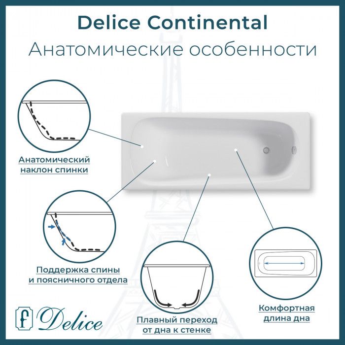 Delice Continental 180х80 - это уютная стильная модель чугунной ванны для вашего дома. Дизайн ванны спроектирован на основе классической формы с учетом современных тенденций в сантехнике. Внутреннее пространство чаши имеет увеличенный объем, анатомическую форму и широкое дно для максимального комфорта при эксплуатации. Continental 180х80 - это отличное решение для больших ванных комнат.