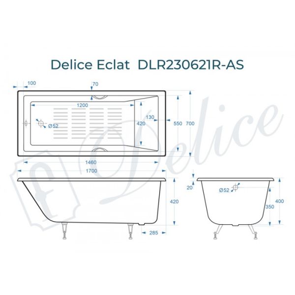 Ванна чугунная Delice Eclat DLR230621R-AS 170х70 с отверстиями под ручки и антискользящим покрытием купить