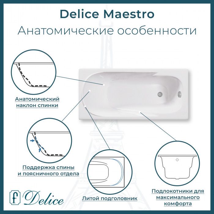 Delice Maestro 200х85 - стильная и удобная чугунная ванна с дизайнерскими декоративными элементами. Оригинальная необычная форма прекрасно будет смотреться в интерьере ванной комнаты и радовать всю семью каждый день. Вместительная и объемная чаша с увеличенной глубиной 45 см - идеальное решение для современной жизни. Модель выполнена с учетом анатомических особенностей, в ней одинаково удобно принимать ванну или душ, ровное широкое дно позволяет свободно перемещаться, а правильный наклон спинки и стенок позволяет легко и комфортно лежать длительное время. Delice Maestro - идеальная семейная ванна для больших помещений!