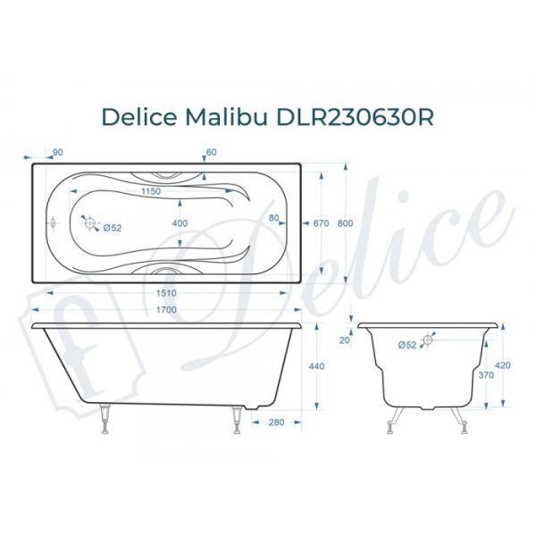 Ванна чугунная Delice Malibu DLR230630R 170х80 с отверстиями под ручки купить