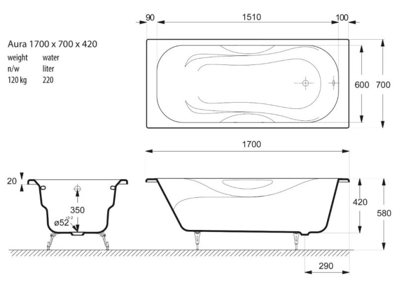 Общие характеристикиРазмер 170х70 Длина 170 см Ширина 70 см Глубина 42 см Высота на ножках 57 см Полезный объём 220 л Вес 120 кг Бренд Vinsent Veron 7 слёв титановой эмали класса 1А Цвет эмали белый Без антискользящего покрытия Диаметр слива Ø52 Расположение перелива стандартное