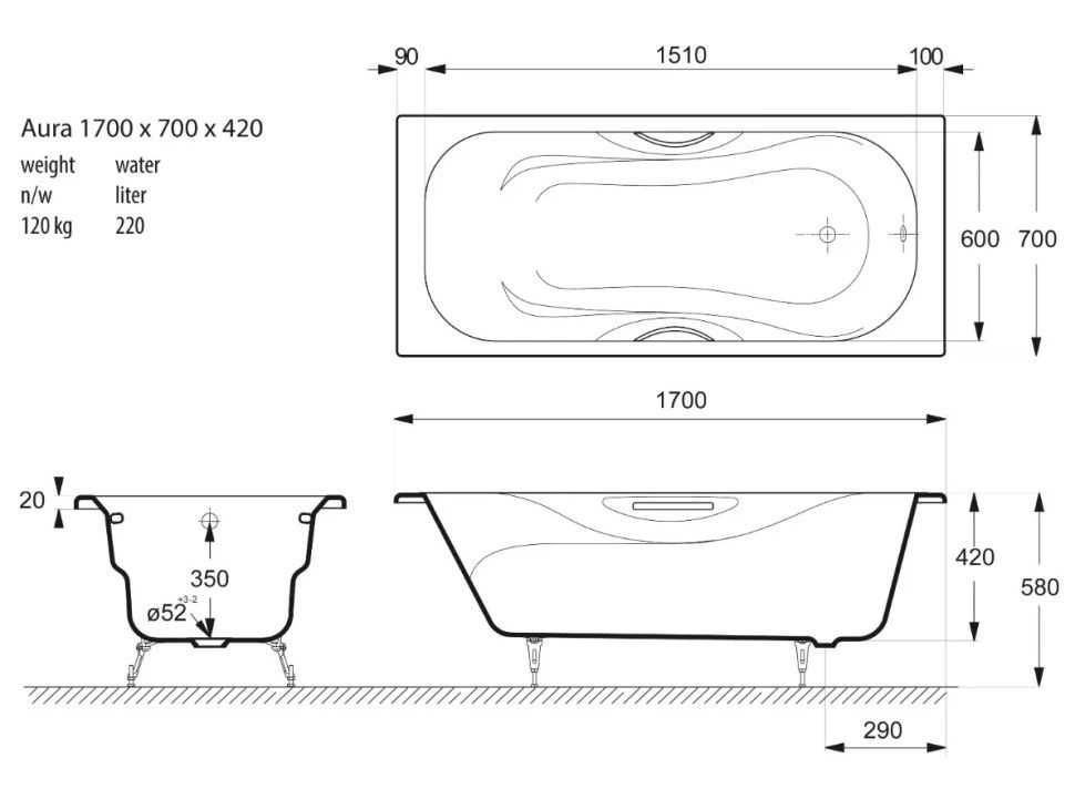 Общие характеристикиРазмер 170х70 Длина 170 см Ширина 70 см Глубина 42 см Высота на ножках 57 см Полезный объём 220 л Вес 120 кг Бренд Vinsent Veron 7 слёв титановой эмали класса 1А Цвет эмали белый Без антискользящего покрытия Диаметр слива Ø52 Расположение перелива стандартное
