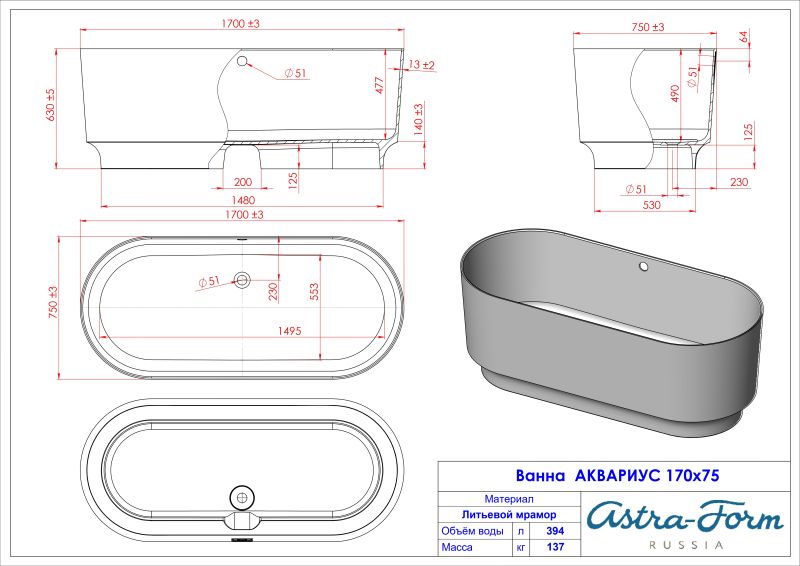 Ванна из искусственного камня Astra-Form Аквариус 01010073 170x75 см белый матовый